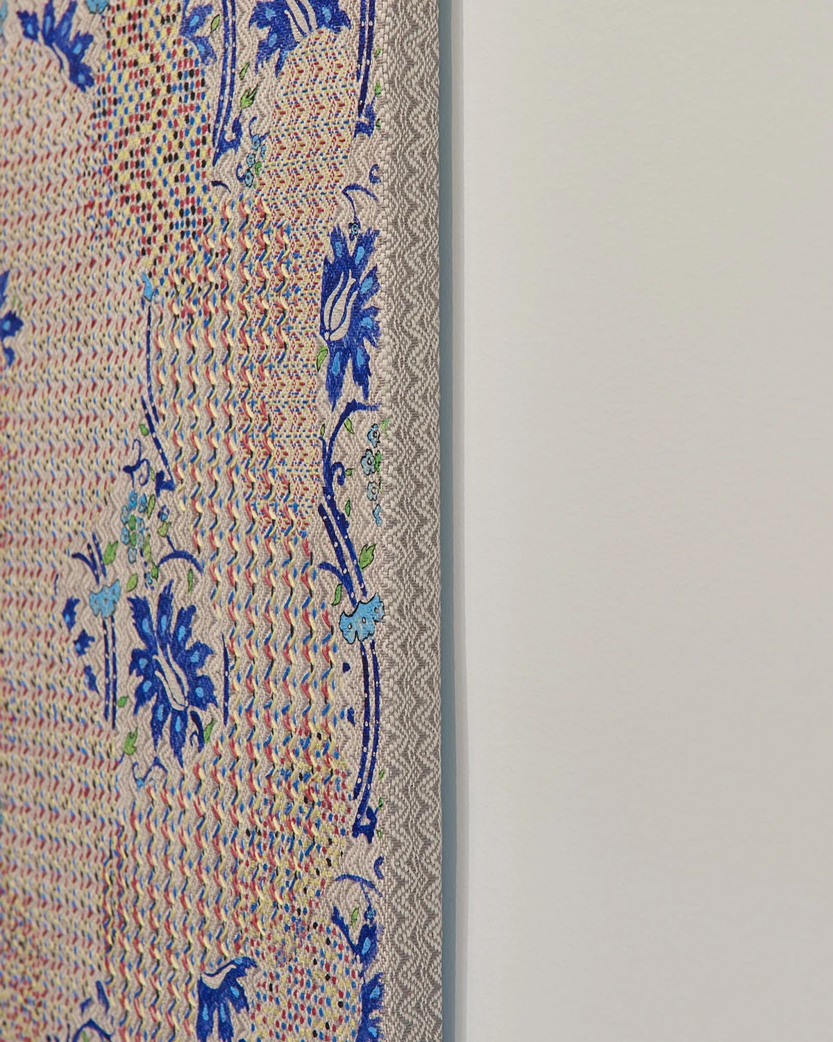 Featuring a floral motif based on an Islamic tile design, Origin, 2019 hangs beneath a window with an aperiodic tile pattern made from transparent colored gels. Taken together, one can draw a link between their underlying geometries, suggesting infinite expansion and a sense of spirituality. In Eden, 2018, the mythic apple tree is replaced with a peach tree pattern, whose fruit is positioned like the picks of a weaving draft and whose visual shorthand is closer to that of an emoji rather than a convention of painting. The Gold Standard, 2019, featuring a pattern of Scrooge McDuck and Krazy Kat, references the rise of abstraction, which coincided with the departure from the gold standard monetary system in the 1930s. In a society where reality is based more in abstraction and systems of representation brought on by technological advancement, these two characters, suspended in motion, are forever on the cusp of tactile engagement with the world and the loosening grip of reality based in concrete, tangible objects. Scrooge, captured in the moment right before diving into a pile of gold, and Krazy, captured in the moment right before being hit with a brick, serve as morally ambiguous foils for humankind.